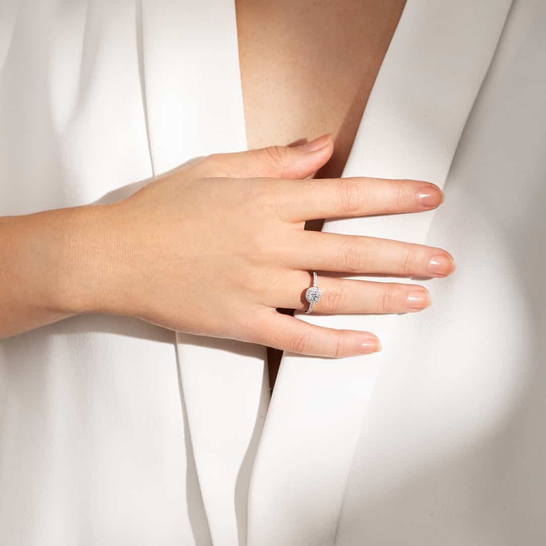 lI pavè di diamanti dell’anello halo round, crea un alone di luce attorno alla pietra centrale.